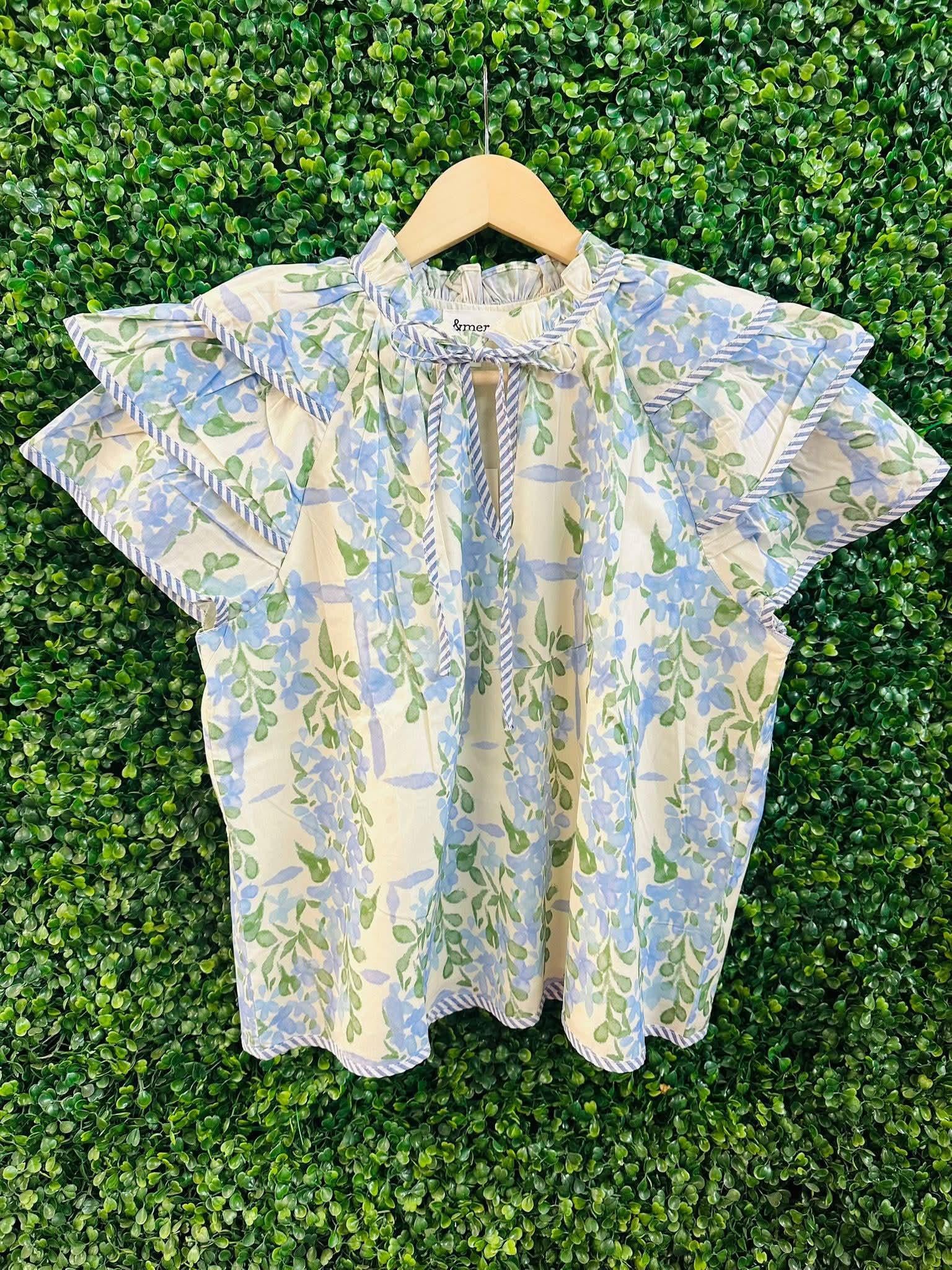 - Blue floral pattern trimmed with blue and white striped trim along the edges