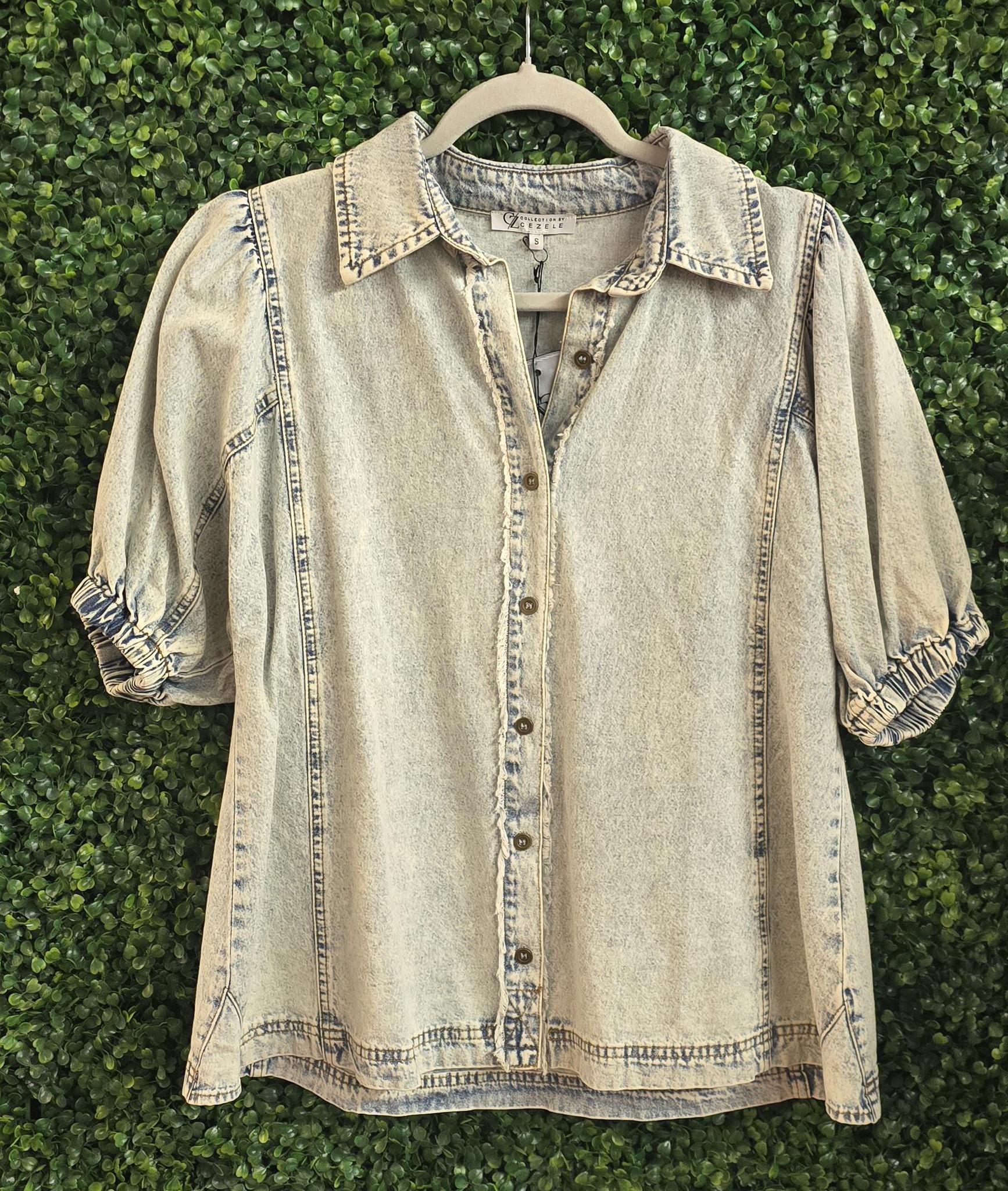 - Light denim was button up shirt with relaxed, vintage inspired look.